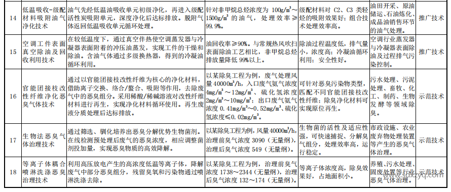 在這些技術(shù)中,有幾項(xiàng)特別引人注目。例如,低溫吸收-級(jí)配材料吸附油氣凈化技術(shù)、空調(diào)工件表面真空除油及回收利用技術(shù)被歸類為推廣技術(shù),這意味著這些技術(shù)已經(jīng)具備了廣泛的應(yīng)用基礎(chǔ)和良好的市場(chǎng)前景。而冷凝-吸附-催化油氣回收凈化技術(shù)、官能團(tuán)接枝改性纖維凈化惡臭氣體技術(shù)、生物法惡臭氣體治理技術(shù)和等離子體耦合噴淋洗滌惡臭治理技術(shù)被列為示范技術(shù),顯示了這些技術(shù)在創(chuàng)新性和應(yīng)用潛力上的優(yōu)勢(shì)。