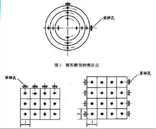 ③對圓形煙道,采樣孔應設在包括各測點在內的相互垂直的直徑線上(如下圖所示)。對矩形或方形煙道,采樣孔應設在包括各測點在內的延長線上(如下圖所示)。