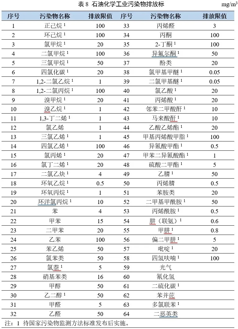 以石油餾分、天然氣等為原料,生產有機化學品、合成樹脂、合成纖維、合成橡膠等的工業(yè),執(zhí)行本標準。本標準是當前國家排放標準中涉VOC特征因子最多的排放標準。但大多數(shù)因子國家還未發(fā)布相關檢測方法。