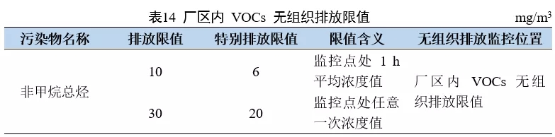 本標準規(guī)定了 VOCs物料儲存無組織排放控制要求、VOCs物料轉移和輸送無組織排放控制要求、工藝過程 VOCs無組織排放控制要求、設備與管線組件 VOCs 泄漏控制要求、敞開液面 VOCs無組織排放控制要求,以及VOCs無組織排放廢氣收集處理系統(tǒng)要求、企業(yè)廠區(qū)內及周邊污染監(jiān)控要求。標準適用于涉及 VOCs無組織排放的現(xiàn)有企業(yè)或生產設施的 VOCs無組織排放管理,以及涉及VOCs無組織排放的建設項目的環(huán)境影響評價、環(huán)境保護設施設計、竣工環(huán)境保護驗收、排污許可證核發(fā)及其投產后的 VOCs無組織排放管理。標準主要對無組織管控提出要求,在限值方面,強調了廠區(qū)內 VOCs 無組織排放的限值要求,見下表。該標準已于 2020 年 7 月 1 日起全面實施。