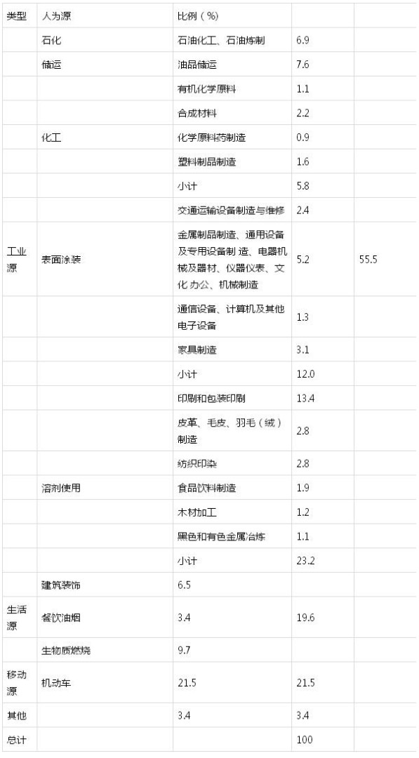 工業(yè)源VOCs排放涉及的行業(yè)眾多,目前缺乏權(quán)威認(rèn)可的排放清單。2009年起環(huán)保部污控司組織中科院生態(tài)中心、清華大學(xué)、同濟(jì)大學(xué)、解放軍防化研究院、地質(zhì)大學(xué)、華南理工大學(xué)等高等院校和科研院所中VOCs防治領(lǐng)域的專家對(duì)人為源排放情況進(jìn)行估算。表1列出了估算的結(jié)果,其中工業(yè)源排放量占整個(gè)人為源的比重最高達(dá)55.5%,工業(yè)源中的重點(diǎn)工業(yè)行業(yè)包括石油煉制和儲(chǔ)運(yùn)、化工、溶劑使用(包括表而涂裝)等。在工業(yè)源的四個(gè)產(chǎn)污環(huán)節(jié)中,含VOCs產(chǎn)品的使用過(guò)程環(huán)節(jié)排放最多,占整個(gè)工業(yè)源排放的60%以上,應(yīng)予以重點(diǎn)控制。